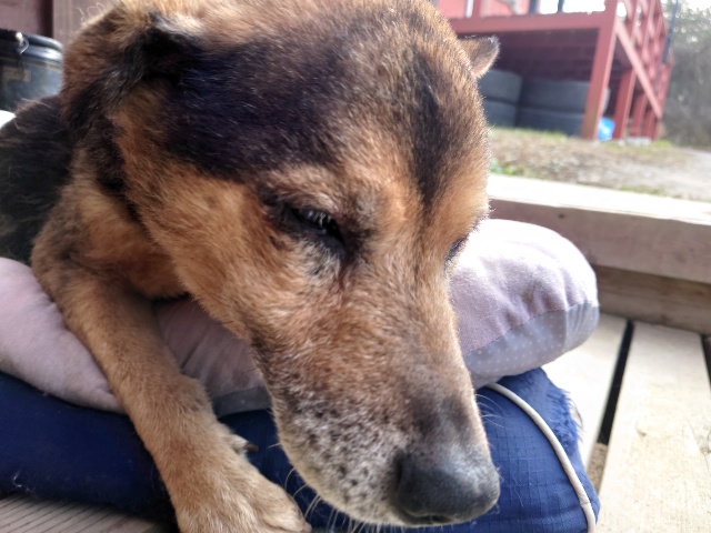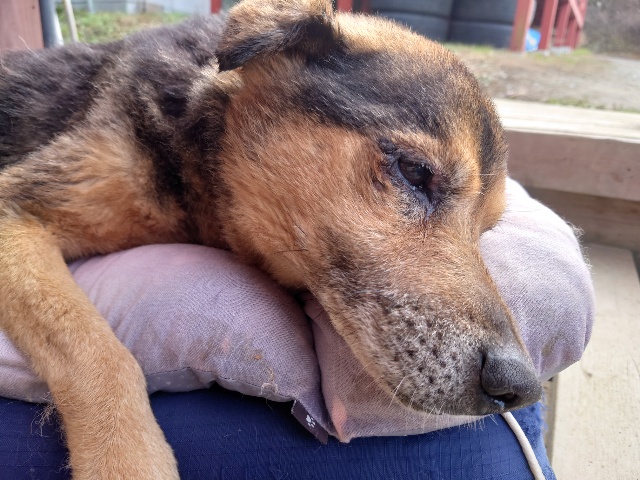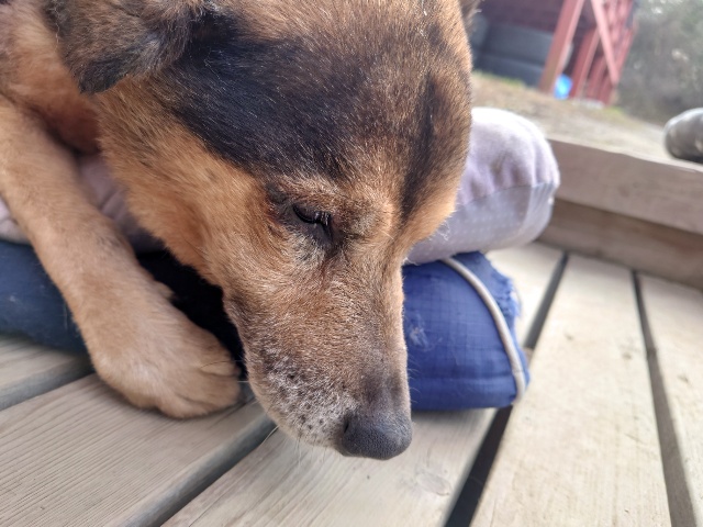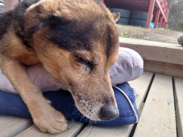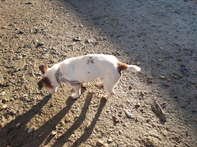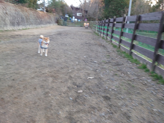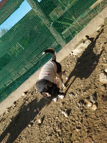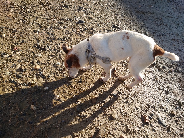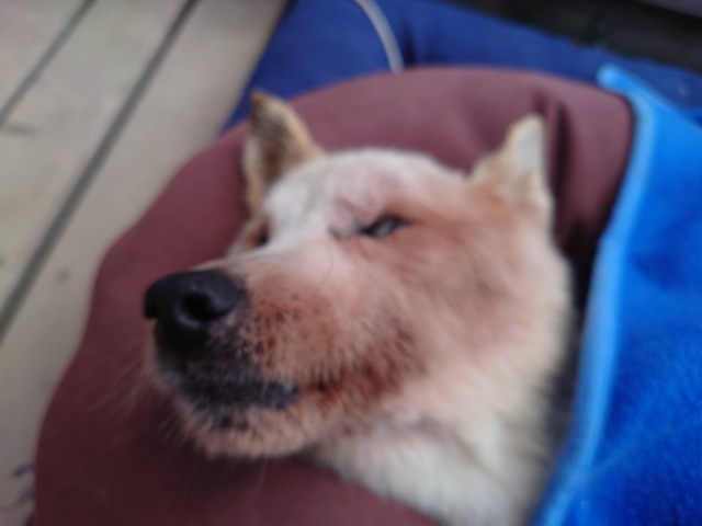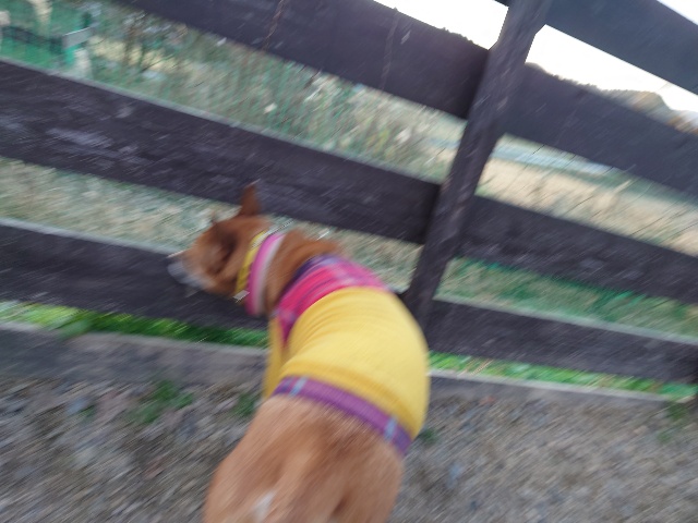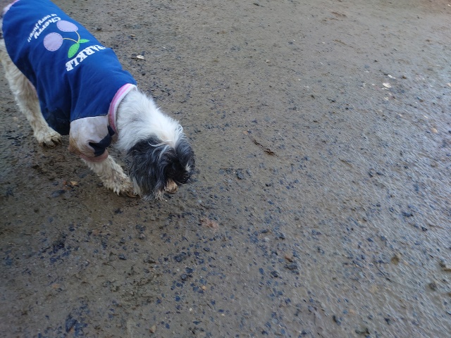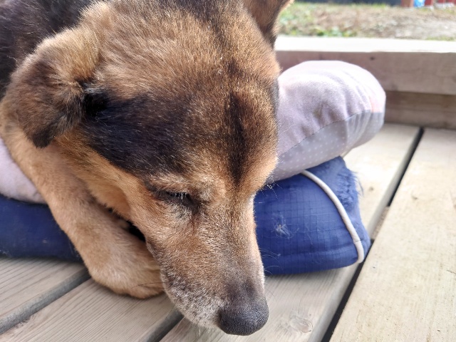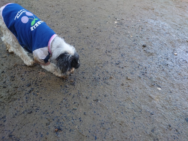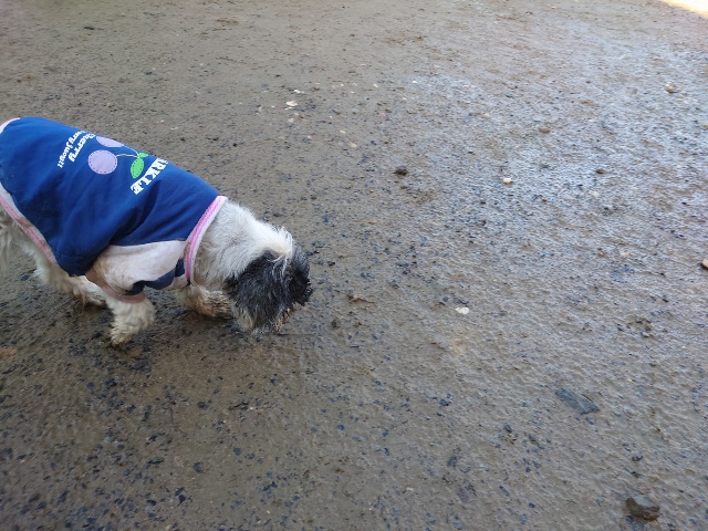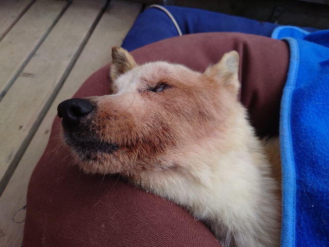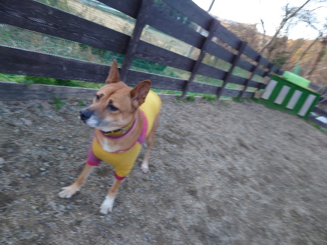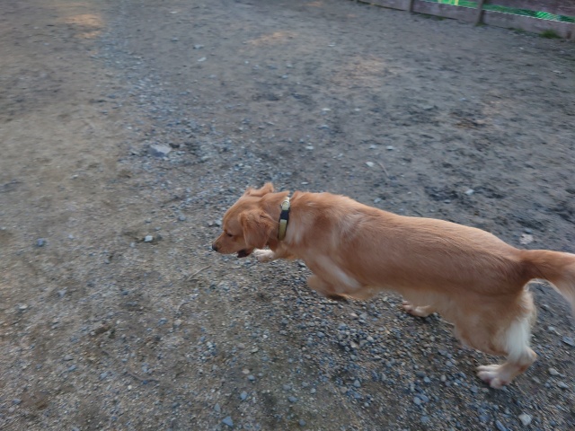 ホームの涼しい犬舎で休んで水分もとり食べやすいウェットフードに切り替えたことでランに出て歩けるように。