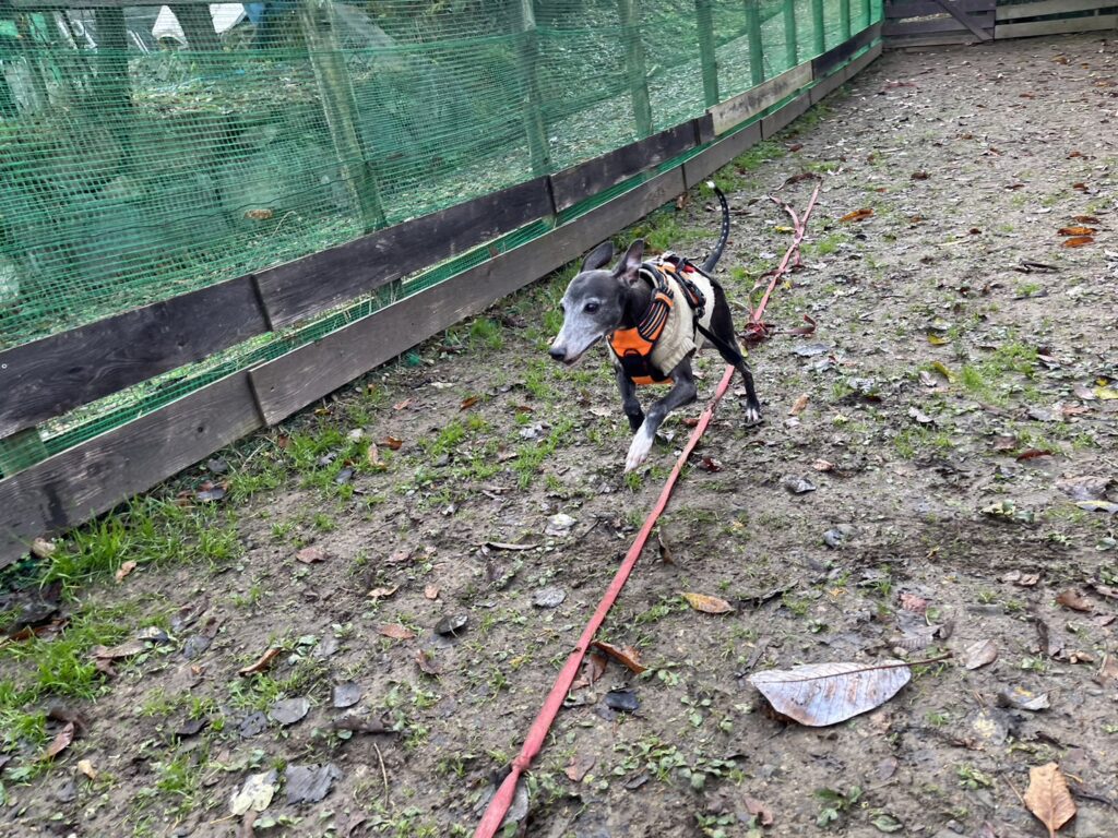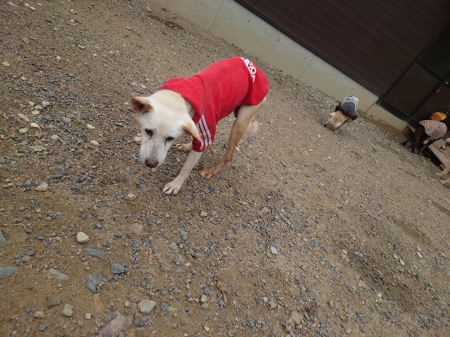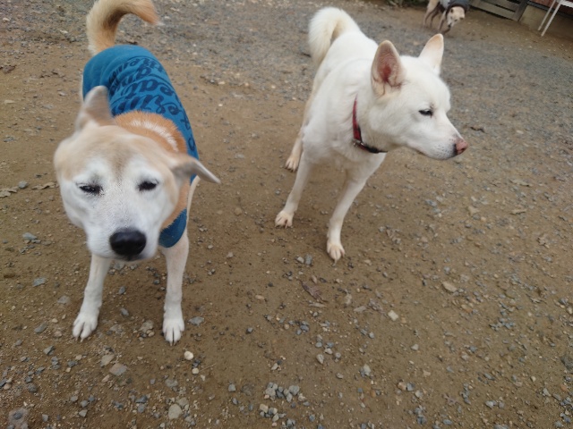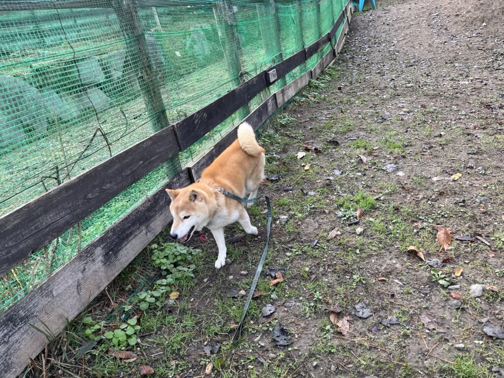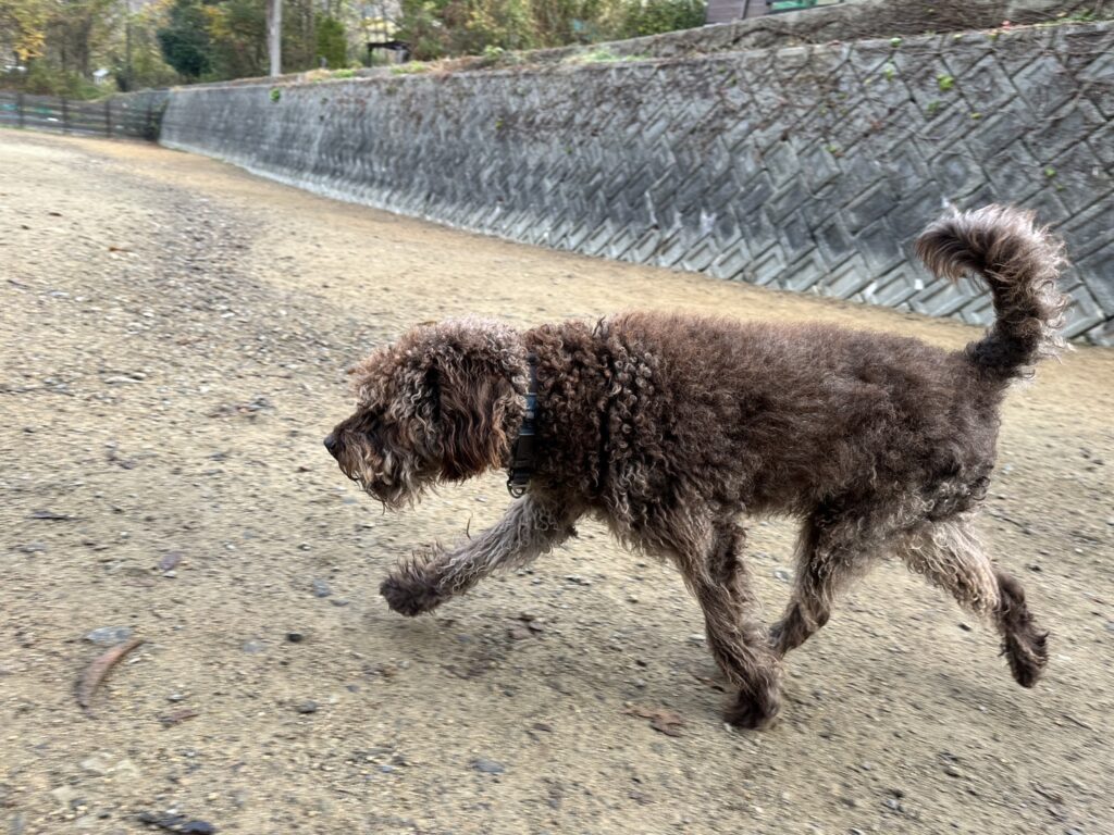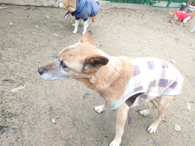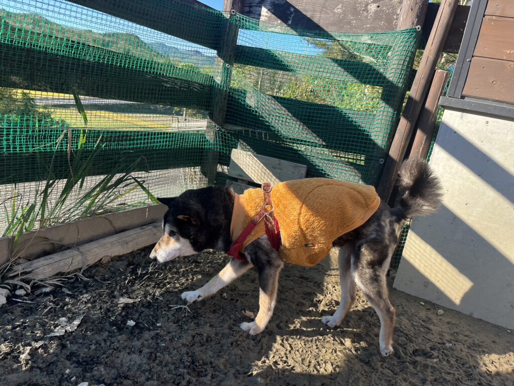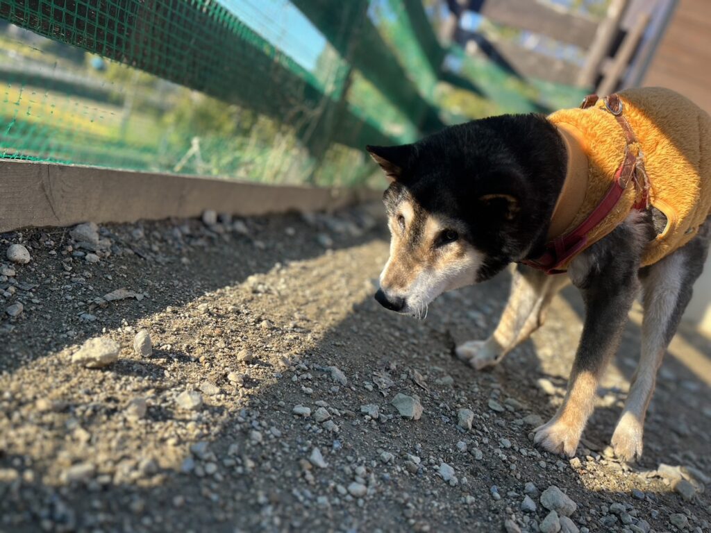 よちよち歩きの子もいるシニア犬、リードをつないでの散歩より自由にできるランの方が楽です。