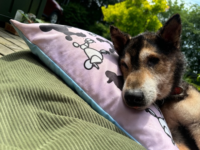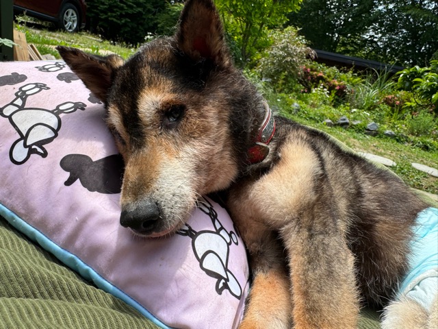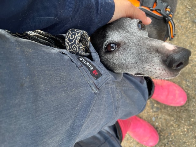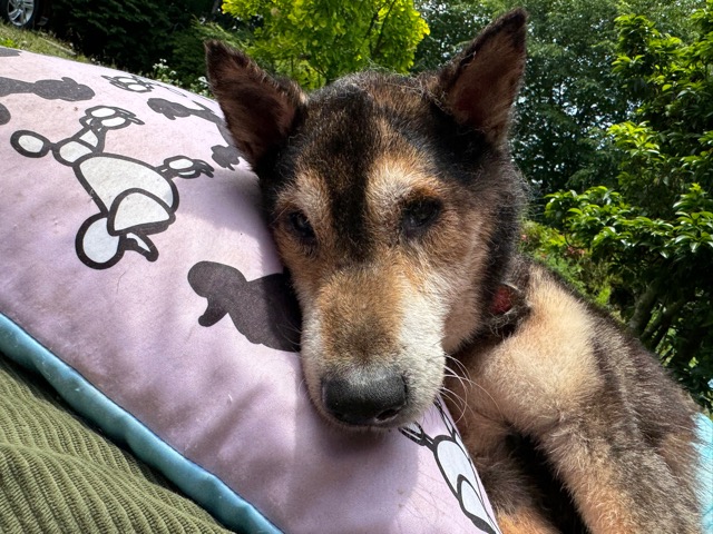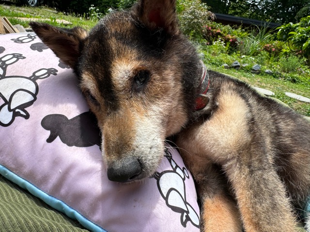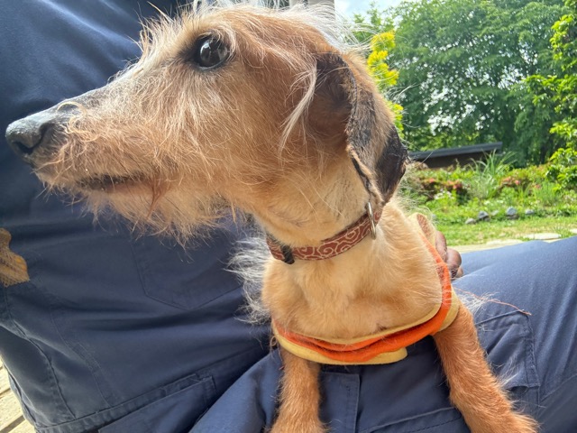 飼い主は高齢の女性のようです。