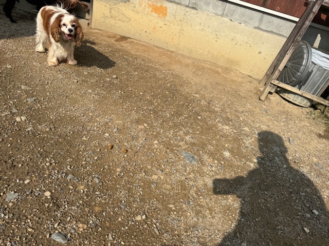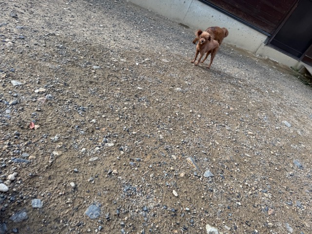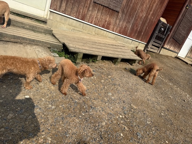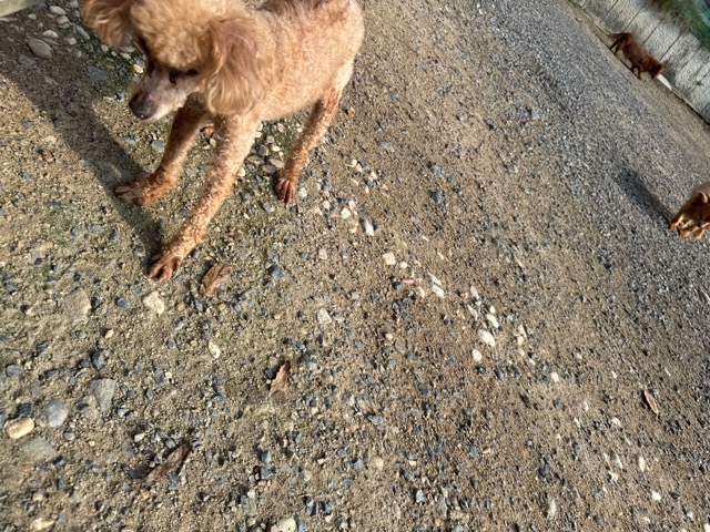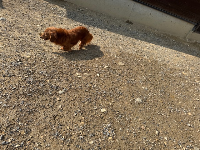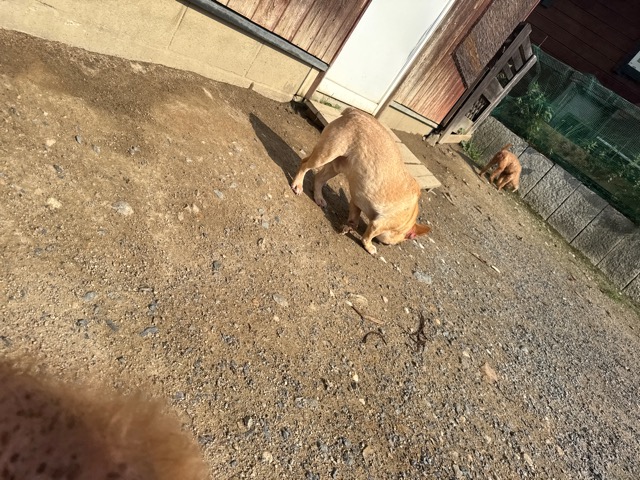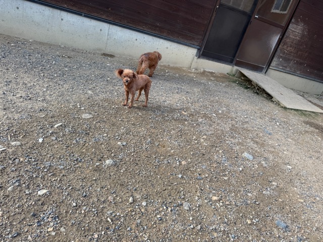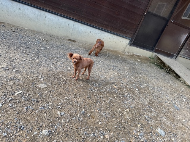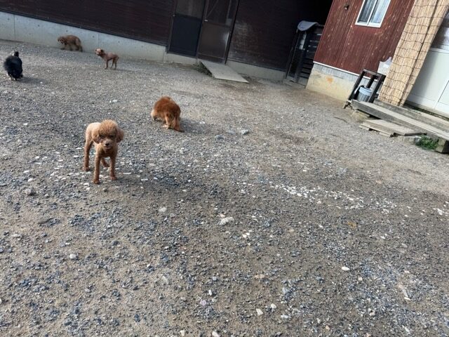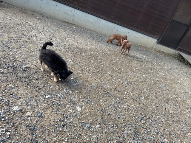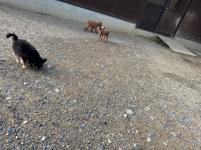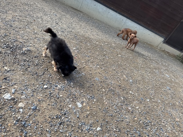 a dog and her puppies are standing on the road 老犬ホームあん|総合ケアハウスの日常